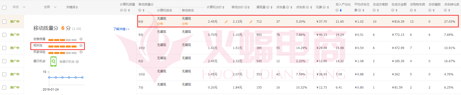 综上所述,有转化的关键词都是相关性较高的关键词,但是质量分并没有很高,总而言之,直通车想要有高ROI,不一定需要高质量分的关键词,但一定需要精准的关键词,关键词如果不精准,即使质量分再高,也不会有很好的数据效果。因此,想要高ROI,就必须要选择符合产品特性,与产品相关性较高的关键词。